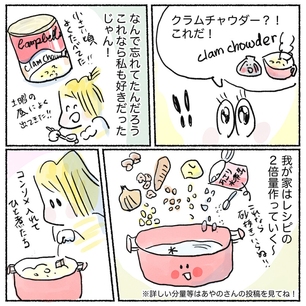 スポンサーリンクおすすめ記事漢検は親子の勉強の取り組みにちょうどいい5人目!アラフォー妊娠日記 まもなく7ヶ月目だわ!【身体によいおむすび作ろう】子供達と餃子と在宅勤務5人目!アラフォー妊娠日記 6ヶ月目となりました クラムチャウダーが最高だった2023.01.25スポンサーリンククラムチャウダーが最高だった あとがき寒い日に作りたくなるスープ。 そのレパートリーがあまりなかったけど、これが仲間入りしました。 本当に簡単で美味しいので、おすすめです! あやのさんのインスタのリンクはこちら! 0
