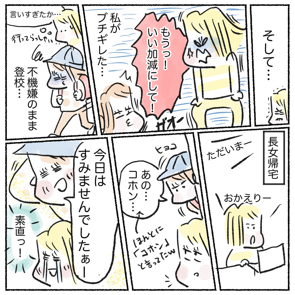 スポンサーリンクおすすめ記事漢検は親子の勉強の取り組みにちょうどいい5人目!アラフォー妊娠日記 まもなく7ヶ月目だわ!【身体によいおむすび作ろう】子供達と餃子と在宅勤務5人目!アラフォー妊娠日記 6ヶ月目となりました 【育児漫画】長女と月曜日の朝2023.07.14スポンサーリンク漫画 コラム結局ブチギレてしまう私の度量のなさもどうかと思うけど、長女も長女で、帰宅すると学校を楽しめているのです。 保育園の行き渋りのようなイメージのうちはむやみやたらに休まない方がいいと思って、どうにか行ってもらっています。 それはさておき、長女も頭ではわかっていて、気持ちがついていってなかった自分をわかっているんですよね。 帰宅後は機嫌もすっかり良くなっていて、素直に朝の出来事を謝ってきました。 0