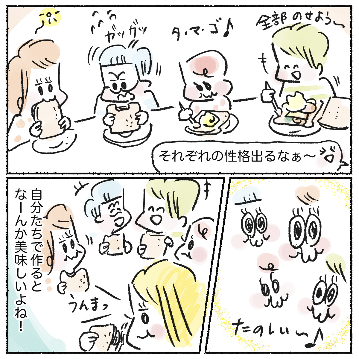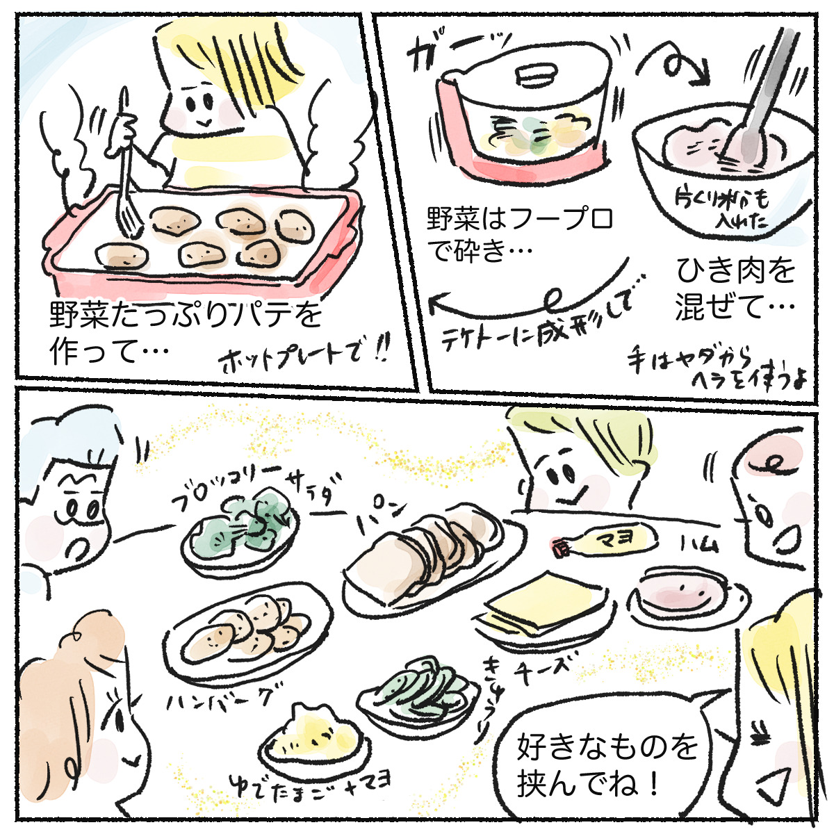 スポンサーリンクおすすめ記事漢検は親子の勉強の取り組みにちょうどいい5人目!アラフォー妊娠日記 まもなく7ヶ月目だわ!【身体によいおむすび作ろう】子供達と餃子と在宅勤務5人目!アラフォー妊娠日記 6ヶ月目となりました 【ご飯漫画】我が家のハンバーガーパーティー2023.07.19スポンサーリンク漫画 コラム我が子たちはあまり野菜を積極的に食べてくれないので、パテにもりもり詰め込んで、さりげなく食卓においたら食べてくれるかな?と思ってやってみました。 まぁ結局のところ、もりもりハンバーグを食べたのは長男くらいでしたが!他のみんなはゆで卵やハムチーズに走っていましたね。 まーそれはそれでよし。 とりあえず「自分たちで好きなものを挟んで作る」っていうのはテンションあがるみたいで、楽しそうでした😊0
