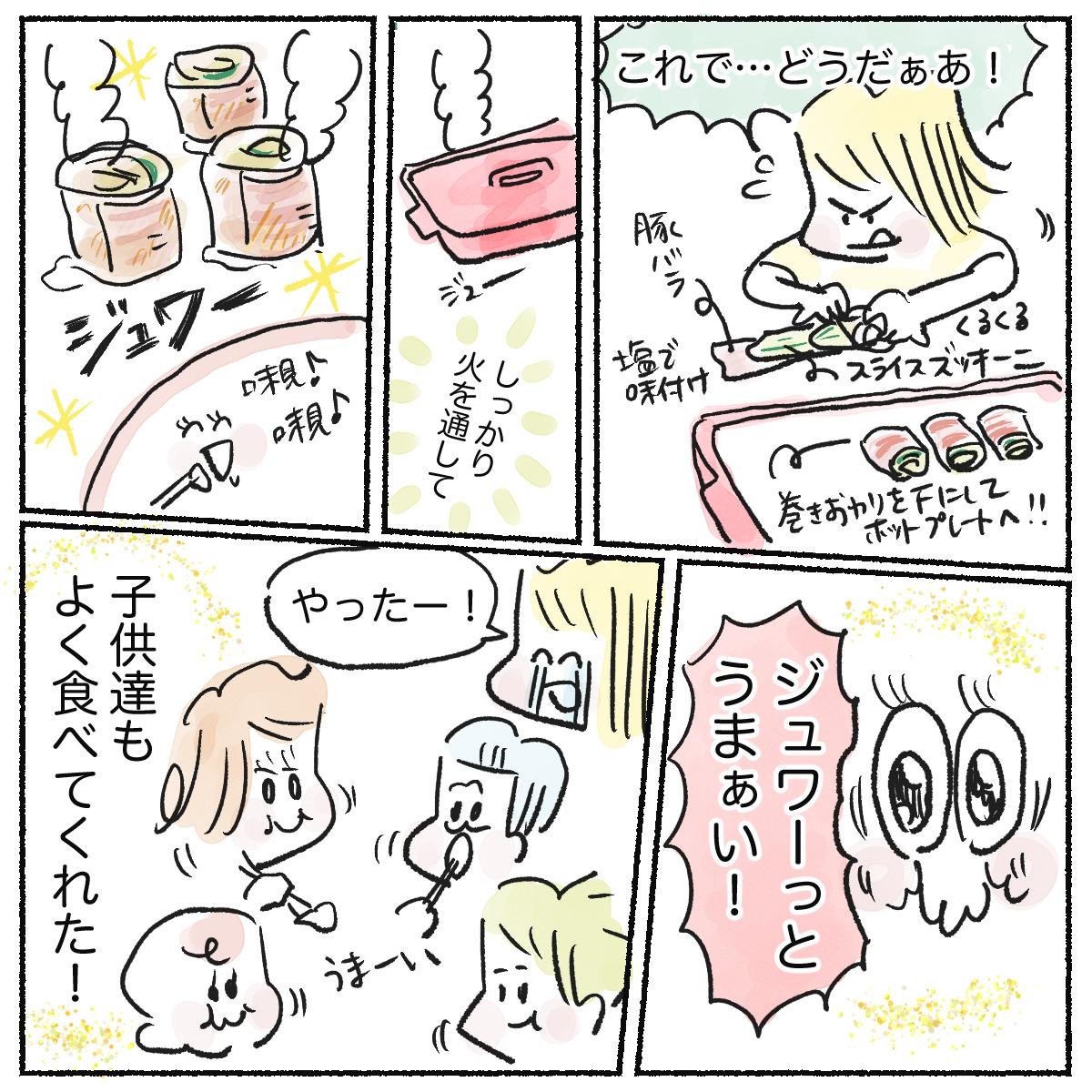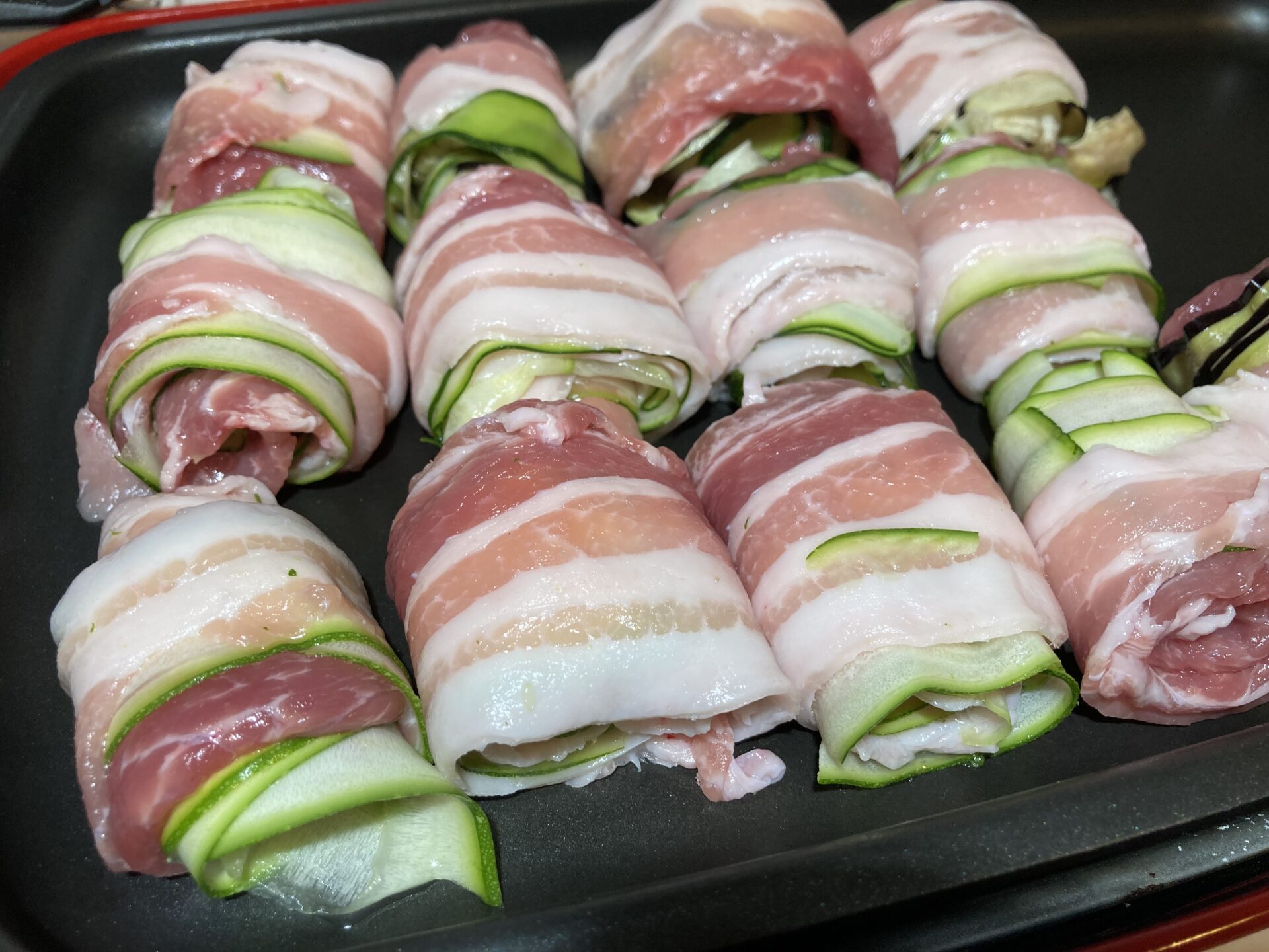 ズッキーニをうすーくスライスしたのを豚バラで巻いて焼いたら