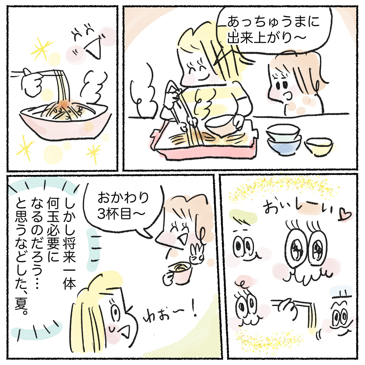 スポンサーリンクおすすめ記事漢検は親子の勉強の取り組みにちょうどいい5人目!アラフォー妊娠日記 まもなく7ヶ月目だわ!【身体によいおむすび作ろう】子供達と餃子と在宅勤務5人目!アラフォー妊娠日記 6ヶ月目となりました 【ごはん漫画】我が家のジャージャー麺2023.08.06スポンサーリンク漫画 コラムやきそばのパックって便利ですよね。いざという時に!というつもりで、冷蔵庫にいれておきます。 でも賞味期限がそこそこ短かったりして、でも消費しなきゃってときに「ソース味」の気分じゃない時もそこそこありまして。 そんなときは、ジャージャー麺です。 案外簡単で、相当美味しいので、子供達もペロリでした。0