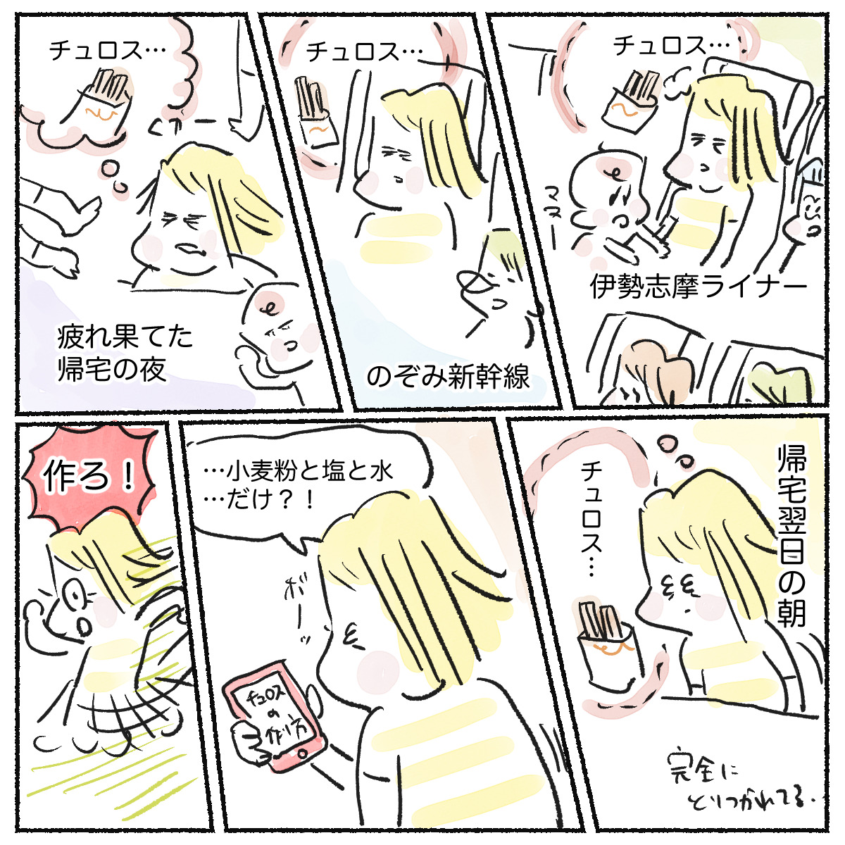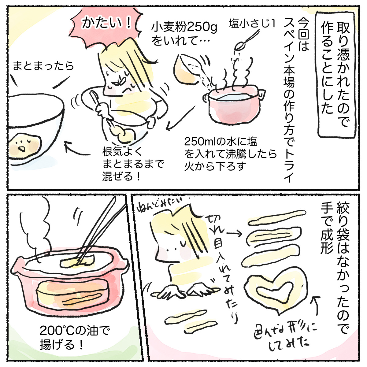 スポンサーリンクおすすめ記事漢検は親子の勉強の取り組みにちょうどいい5人目!アラフォー妊娠日記 まもなく7ヶ月目だわ!【身体によいおむすび作ろう】子供達と餃子と在宅勤務5人目!アラフォー妊娠日記 6ヶ月目となりました 【おやつ漫画】チュロスが食べたい2023.08.22スポンサーリンク漫画 広告 コラム志摩スペイン村へ夏休みの家族旅行で行ってまいりました。結構な道のりなんですが、現地はとても快適で(空いてて!)寂れてる感じはなく、ひとつひとつが丁寧な印象でした。 中でもチュロスがとても美味しかったんですよ! それが頭から離れなくて、作ってみました。 まぁ、なんでしょうね。あのチュロスではなかったですよ! でもそれはそれで美味しいおやつでした。また別のレシピで作ってみるぞ!0