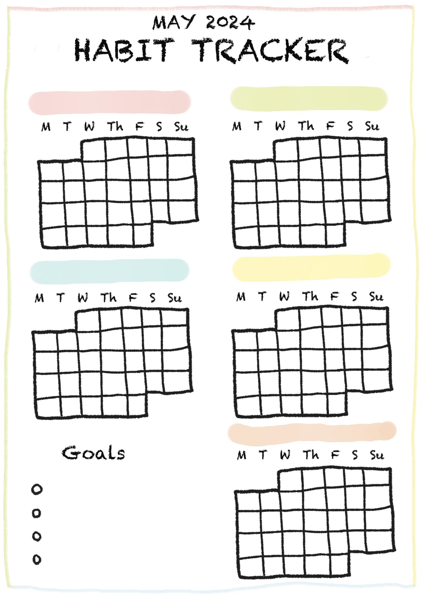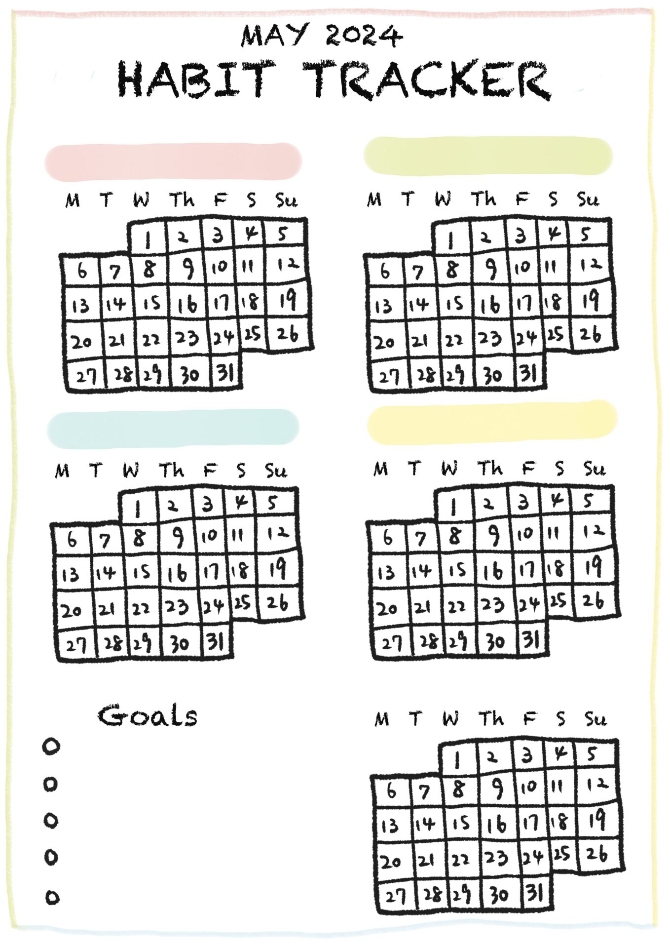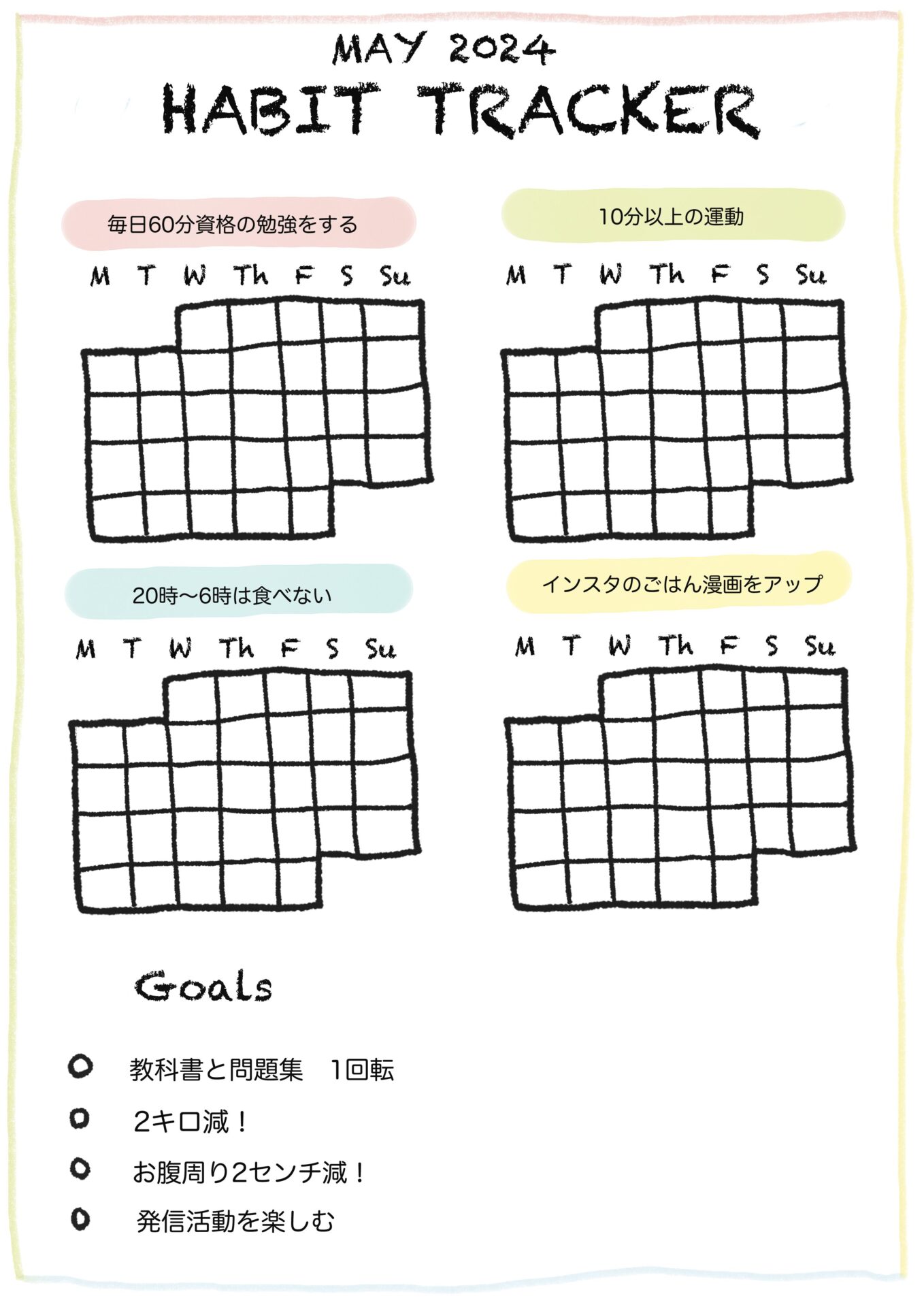 スポンサーリンクおすすめ記事漢検は親子の勉強の取り組みにちょうどいい5人目!アラフォー妊娠日記 まもなく7ヶ月目だわ!【身体によいおむすび作ろう】子供達と餃子と在宅勤務5人目!アラフォー妊娠日記 6ヶ月目となりました 【習慣化シート】5月 Free habit tracker (May)2024.05.06スポンサーリンク5月 習慣化シート Habit Tracker Mayインスタでこんなのを作ってる方をみて、自分でも作ってみたくなりました。とりあえずシンプルに。そのうち改造していこうかと。良かったらコピーして好きに使ってくださいね。例えば私はこんな感じに使う予定!印刷して壁に貼って、塗りつぶしていこうかと。どうだろう?改訂版1もう少し習慣化するものが欲しくなったので、4つから5つに枠を増やしました。よかったらご自由にどうぞ!改良版2日付をいれたバージョン0